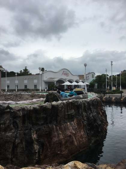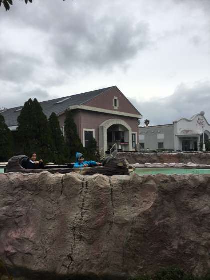 天気は小雨。ジェットコースターは残念ながら運休ですが、急流すべりやバイキングは動いています。