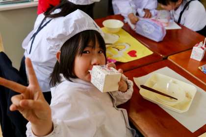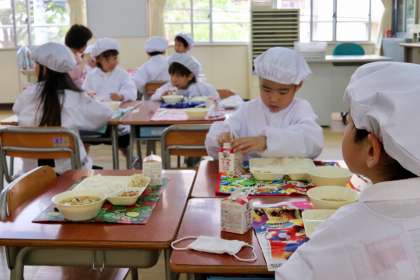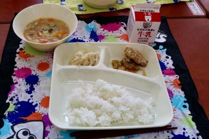 今日の給食は、やきとり、もやしのゆずの香あえ、みそ汁でした。どの学年も食欲は旺盛で、残さずしっかりと食べています。