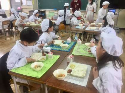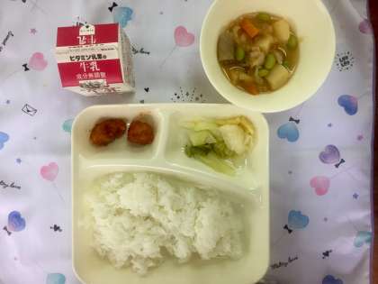 今日の給食は、まぐろのオーロラ煮、じゃがいもと野菜の含め煮、キャベツの梅風味でした。オーロラ煮は、みんなに人気でした。