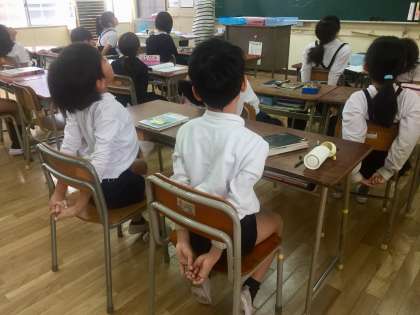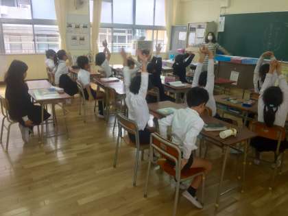 1時間目の学習がはじまるまでに、それぞれの教室では、姿勢体操をします。体をほぐし、背筋を伸ばすことで学習に向かう体づくりをします。