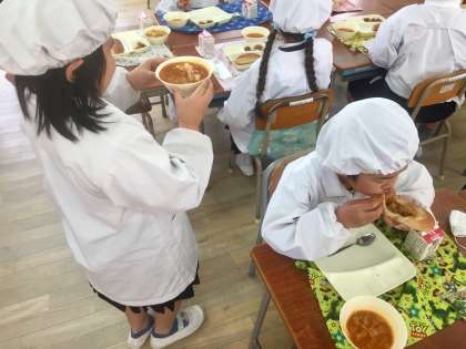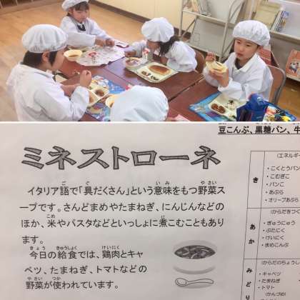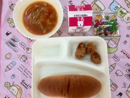 今日の給食は、ミネストローネ、一口とんかつ、豆こんぶでした。野菜たっぷりのスープと一口かつ、久しぶりの給食に、みんな大満足でした。