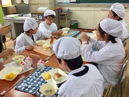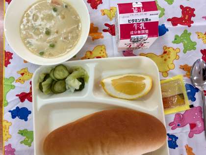 今日の給食は、コーンクリームシチュー、キャベツときゅうりのサラダ、かわちばんかんでした。クリームシチューのこってり感と、サラダやみかんのさっぱり感が、とてもいい取り合わせでした。