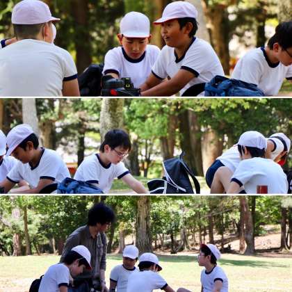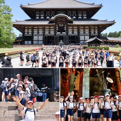 南大門の仁王像を眺めながら、いよいよ大仏と対面です。はじめて大仏を目にする子も多くて、その大きさにびっくりしていました。また、柱の穴くぐりに挑戦しました。今年のめあては、チャレンジです。