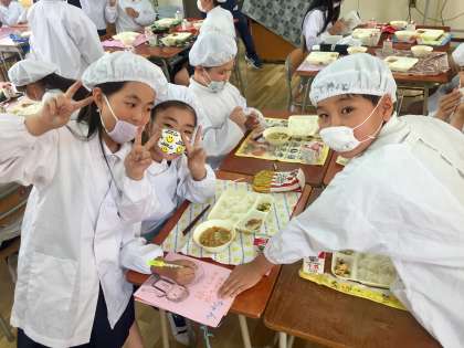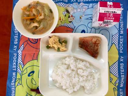 今日の給食は、あかうおのしょうゆだれかけ、みそ汁でした。具だくさんのみそ汁にあかうおは、とてもごはんに合う献立です。みんな、もりもり食べていました。