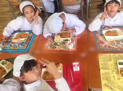 今日の給食は、ミートソース・スパゲッティ、きゅうりのバジル風味サラダでした。スパゲッティは、どの子も大盛りで、大満足でした。
