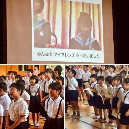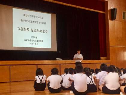 22年前、浪速区内で登校中の児童が殺傷される事件が起きました。自分たちの町でも、先日の川崎市のような事件が起きたことを、ほとんどの子は知りません。なにわ子ども人権文化祭は、一人ひとりのきづなをつくっていくことで、命を守ろうという願いがこめられた行事です。そのことを心に刻みながら、児童集会で「マイフレンズ」を歌いました。