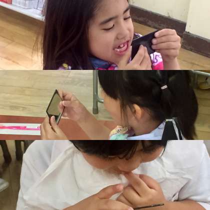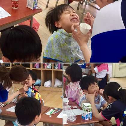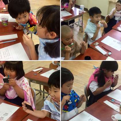 給食後は、みんな歯磨きをしています。今日は、その磨き残しのチェックをしました。磨けていないところが、赤く染まる液を歯につけて調べます。みんな、真剣に磨き残しを確かめながら、歯磨きをしていました。