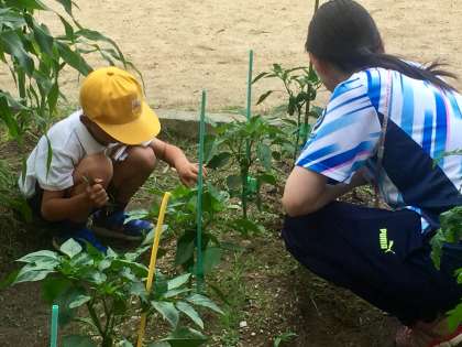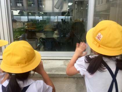 1年生は、いろいろなことに興味を持ちます。栽培しているあさがお、ピーマンになすびはもちろんです。今日は、給食をつくっている調理員さんの仕事を、一生懸命に見学していました。窓越しではあっても、大きな釜や、それをつかって給食を作る様子を見ることができます。最後は、「調理員さん、がんばって!」と手をふっていました。