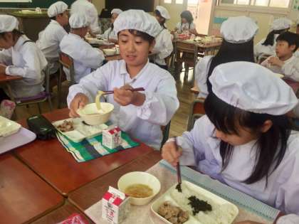 今日の給食は、豚肉のごまみそ焼き、すまし汁、のりの佃煮でした。子どもたちが大好きな、ごはんがすすむメニューです。