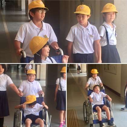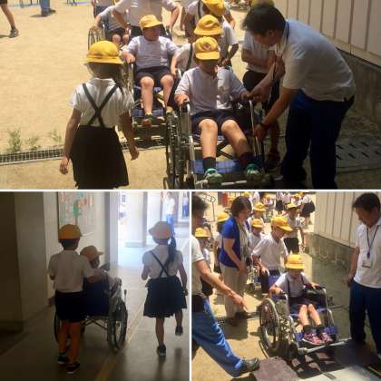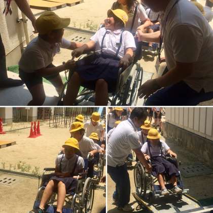 講堂の中で車いすに慣れた後、校内を車いすで移動する体験をしました。わずかな段差があれば、車いすは自力では乗り越えることができないことを実感しました。