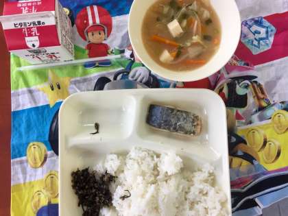 今日の給食は、さごしの塩焼き、みそ汁、牛ひじきそぼろでした。さごしの塩焼きは、食べやすく、講評でした。