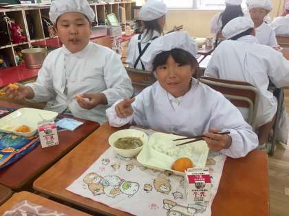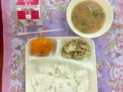 今日の給食は、ピリ辛野菜いため、オクラとん汁、みかん(冷凍)でした。つめたいみかんを口にすると、夏が来たと思います。