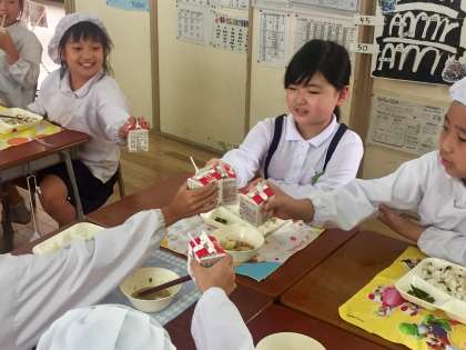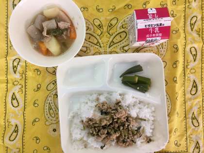 今日の給食は、豚肉とじゃがいもの煮物、オクラの甘酢あえ、ツナっ葉いためでした。4年生ではお誕生日の子がいたので、みんなで乾杯しました。みんながそろうというのは、いいですね。