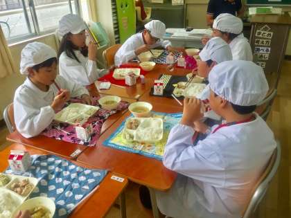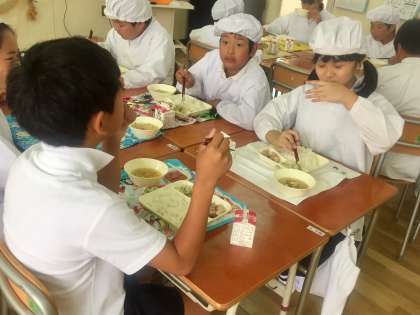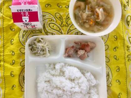 今日の給食は、鶏肉のしょうゆマヨネーズ焼き、五目汁、切干し大根のゆずの香あえでした。しょうゆマヨネーズは、子どもたちに人気の味付けで、おいしそうに食べていました。