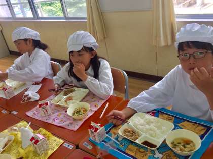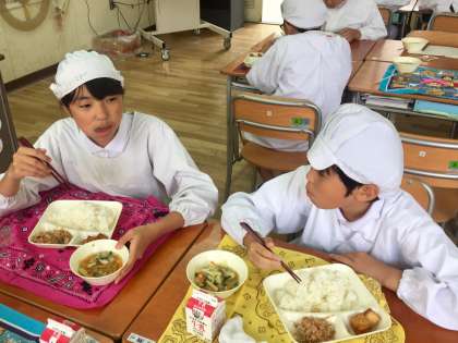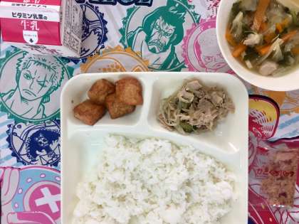 今日の給食は、ゴーヤチャンプル、すまし汁、あつあげの生姜じょうゆかけでした。ごはんがとっても進む献立で、おいしそうに食べていました。