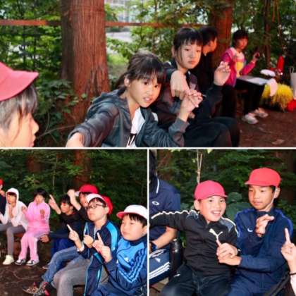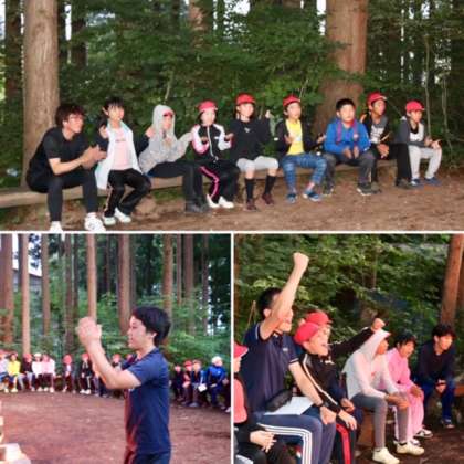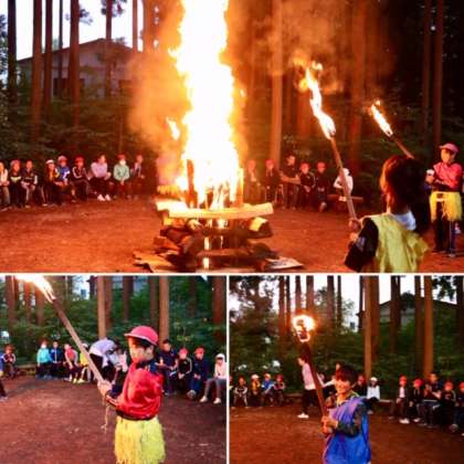 19時からキャンプファイアが始まりました。自分たちで灯したファイアの明かりに照らされて、楽しい出し物で楽しみました。