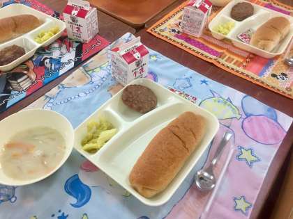 今日の給食は、焼きハンバーグ、豆乳スープ、キャベツのカレーソテーでした。みんな思い思いに楽しみにがら、給食を食べていました。