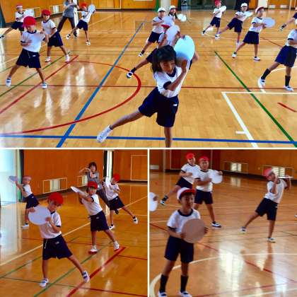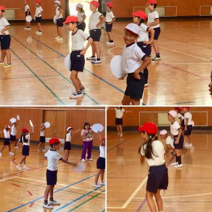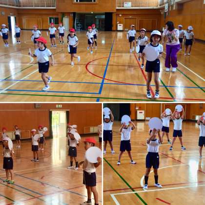 1・2年生も演技の練習をはじめています。熱中症をふせぐために、体育館での練習をしています。暑さに負けずに、笑顔でおどっています。