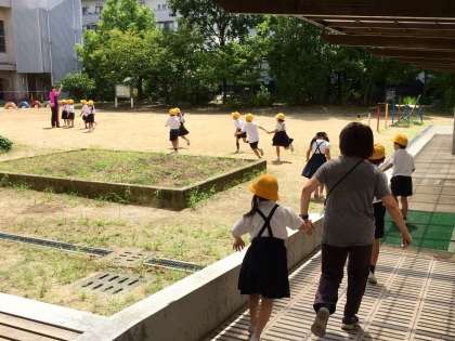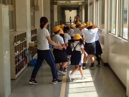 避難を伝える無線放送とともに、子どもたちは行動をはじめました。先生の指示をまもり、1学期よりもはやく運動場に集合することができました。時間を意識して、すばやく行動することが身についてきました。