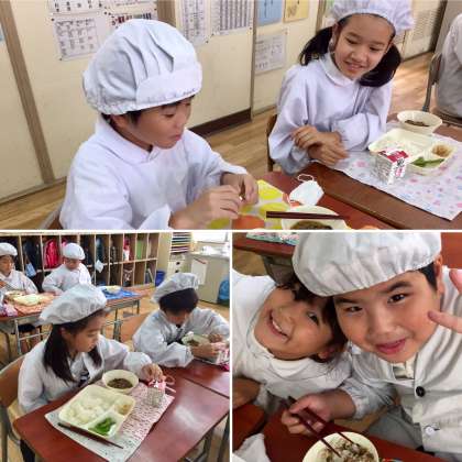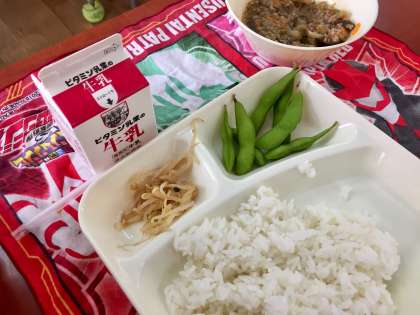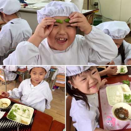 今日の給食は、マーボーなす、もやしのごま酢あえ、えだまめでした。子どもたちは、えだまめが大好きで、うれしそうに食べていました。