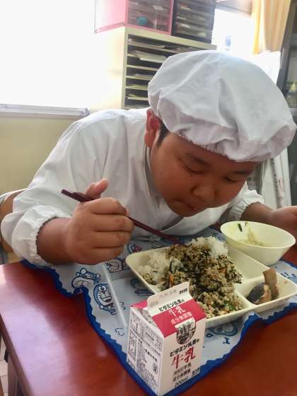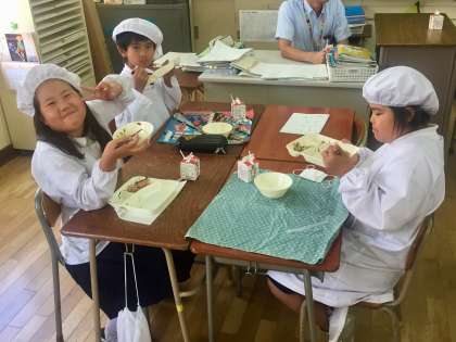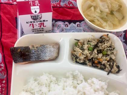 今日の給食は、さけのしょうゆ焼き、五目汁、高野どうふのいり煮でした。いり煮は、ごはんと混ぜてもおいしくて、子どもたちには好評でした。