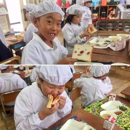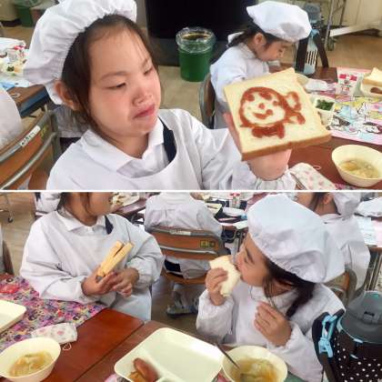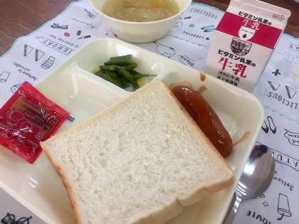 今日の給食は、フランクフルトのケチャップソース、スープ、さんどまめとコーンのサラダでした。「いただきます」と同時に、パンにフランクフルトをはさんで、ガブリ!という子もいました。