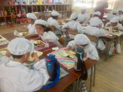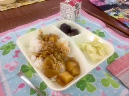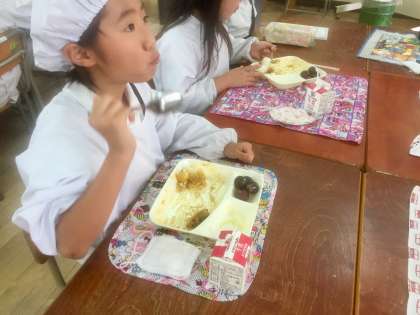 今日の給食は、チキンカレーライス、キャベツのピクルス、ぶどうでした。運動会の練習で、おなかが減っているので、みんなモリモリと食べていました。