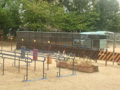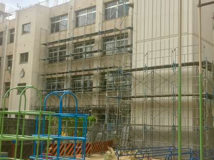 校舎外壁の補修工事にともなう、足場や侵入防止の柵ができています。しばらくは、運動場は使えません。その分、グラウンドで遊びましょう。
