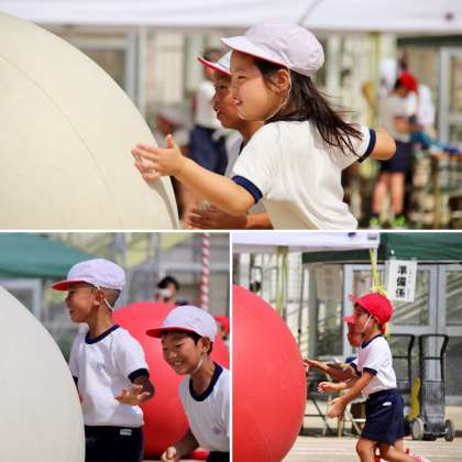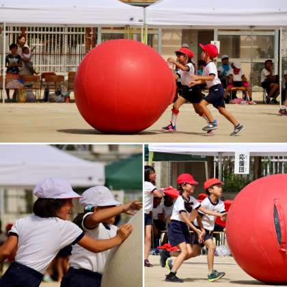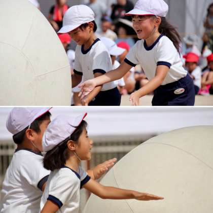 大きな玉に苦労にながら、力を合わせて必死にころがしました。