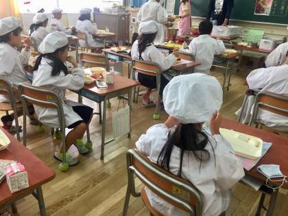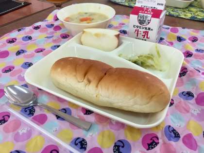 今日の給食は、コーンクリームシチュー、はくさいのピクルス、りんごでした。寒くなってくると恋しいクリームシチューですが、まだまだしばらくは暑い日が続きそうです。