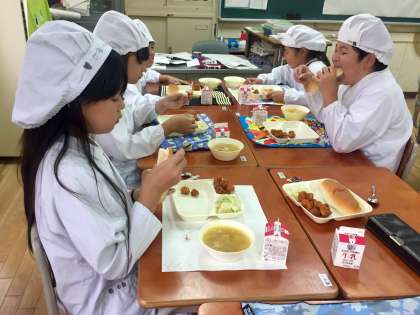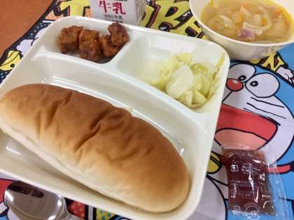 今日の給食は、まぐろのオーロラ煮、ベーコンとじゃがいものスープ、キャベツのゆずドレッシングでした。オーロラ煮は人気メニューで、おかわりをする子がたくさんいました。