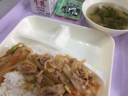 今日の給食は、ピリ辛丼、中華スープ、ソフト黒豆でした。ソフト黒豆は、とてもやわらかく、あま納豆のような食感で、おいしかったです。