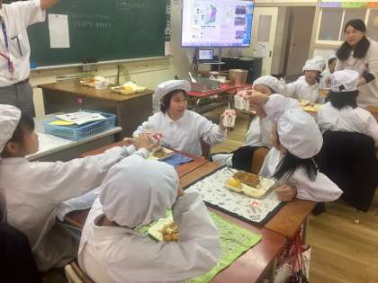 今日の給食は、ポークカレーライス、キャベツのサラダ、みかんでした。お誕生日をクラス全員でお祝いする楽しい給食の時間に出会いました。