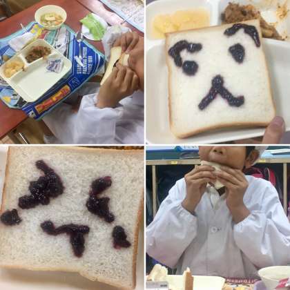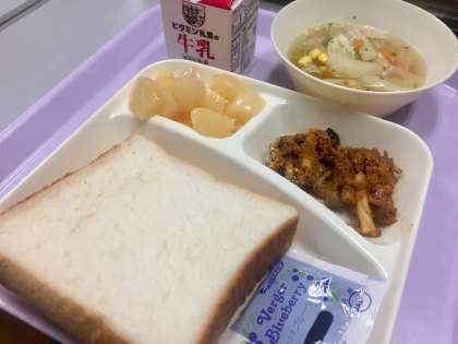 今日の給食は、なすのミートグラタン、鶏肉と野菜のスープ、白桃、ブルーベリージャムでした。グラタンに舌鼓を打ちながら、フルーツもたっぷりで、食べごたえのある献立でした。