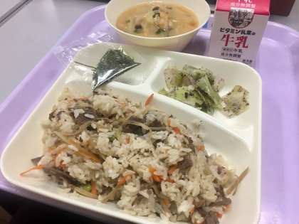 今日の給食は、牛肉のきんぴらちらし、みそ汁、キャベツの赤じそあえでした。炊き込みごはんは、食べやすくてお腹がいっぱいになりました。
