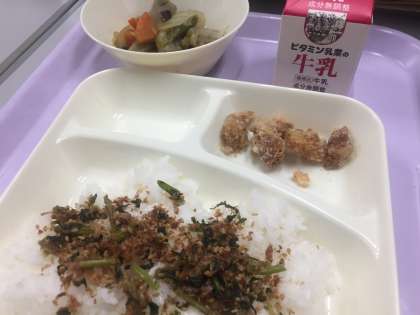 今日の給食は、鶏肉の立田あげ、あつあげと野菜の煮物、おかか菜っ葉でした。ごはんにふりかけというのは、子どもたちは大好きで、もりもりと食べていました。