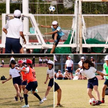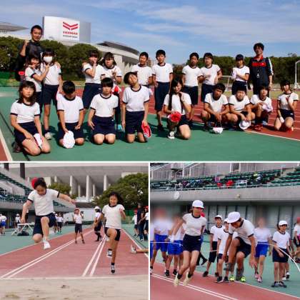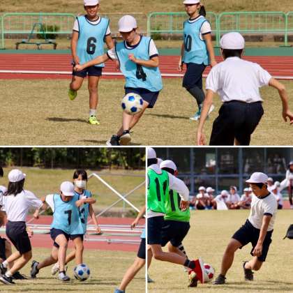 国際陸上やプロサッカーの試合が行われるスタジアムで、競技ができるのも、貴重な機会ですが、他校の子どもたちと仲良くなれるのも、うれしいことでした。いつもとは違うメンバーで、たのしく遊んでいました。