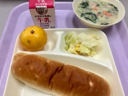 今日の給食は、ほたて貝のクリームシチュー、キャベツとコーンのサラダ、みかんでした。立冬をむかえ、あたたかいシチューがうれしい気候になってきました。