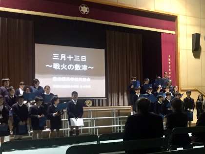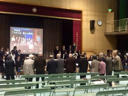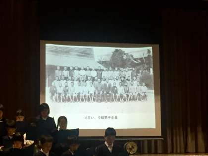 敷津小学校は、昭和20年3月13日の第1次大阪大空襲で校舎が焼失しました。卒業式を、14日に控えていた初等科6年生の卒業式は幻となりました。敷津小学校では、その当時の卒業生とずっと交流を続け、劇や呼びかけに作ってきました。今日は、高齢になられた卒業生のみなさんの最後の同窓会でした。74年前に歌えなかった「蛍の光」を歌っておられるのは、まぎれもなく「12才の姿」でした。