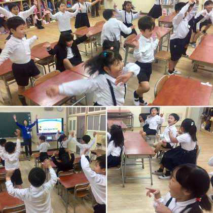 1年生は、笑顔がはじける学年です。英語の動画が流れると、自然と体がうごき、踊り出します。楽しみながら、笑顔のレッスンです。