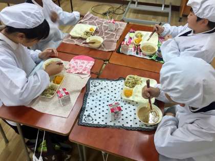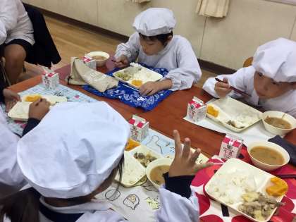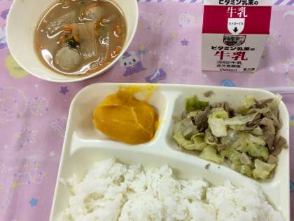 今日の給食は、豚肉とまいたけのいためもの、つみれ汁、かぼちゃのういろうでした。つみれ汁は、苦手という子もいましたが、残さずに食べていました。