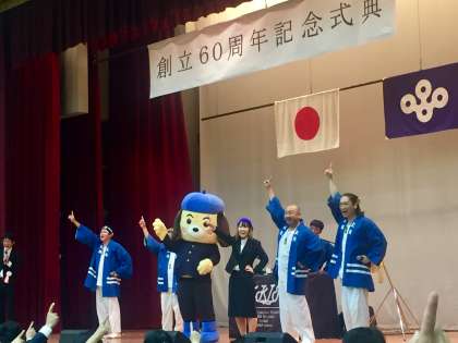 大阪府立難波支援学校が、創立60周年をむかえられました。この学校は、昭和34年に大阪市立難波養護学校として、塩草1丁目に開校しました。以来、校名の変更や校舎の移転を経ながらも、大きく発展してこられました。式典のフィーナーレには、ET−KINGと、学校のマスコット「なんばーワンくん」の登場で、とても盛り上がりました。