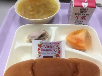 今日の給食は、鶏肉のガーリックマヨネーズ焼き、スープ、柿でした。柿が苦手な子と大好きな子がいて、一人でいくつも食べている子がいました。