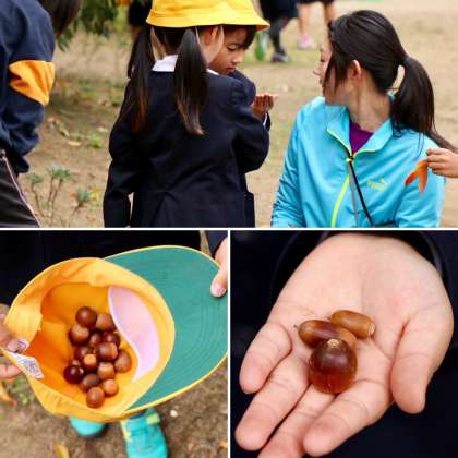 いつの間にか、ビオトープの木々も色づいてきました。1年生が、どんぐりや落ち葉をさがしていました。身近な自然を通して、季節の移り変わりを感じています。