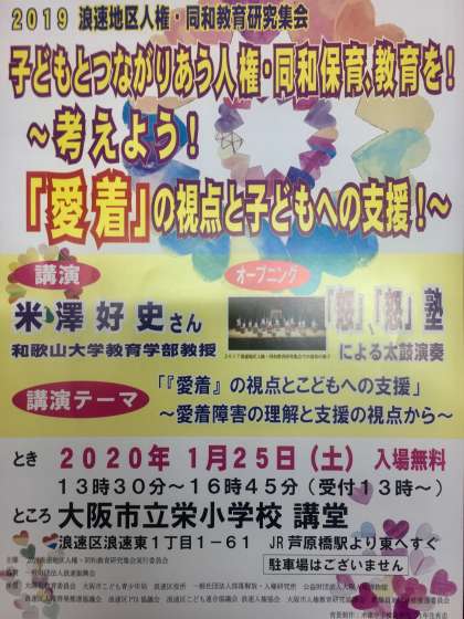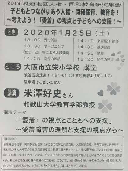 昨年度、本校で教職員向けの講演をしていただいて好評だった、米澤好史先生(和歌山大学教授)が、「愛着」の視点で子どもへの支援について講演をしてくださいます。教育だけでなく多くの現場を知っておられる先生ですから、必ず子育てのヒントとなるお話を聞くことができます。