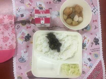 今日の給食は、関東煮、あっさりキャベツ、のりのつくだ煮でした。江戸時代に大坂の佃村から移住した場所が、現在の東京都佃島です。食べ物にも、地名にもその名を残しています。