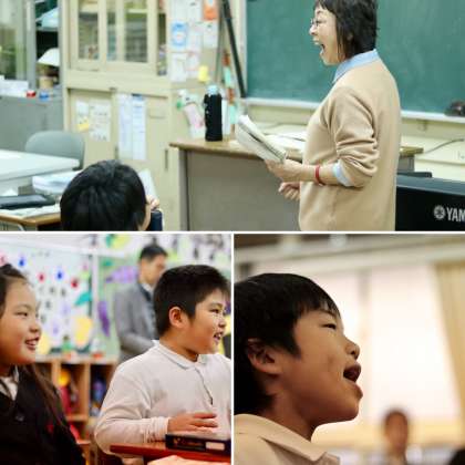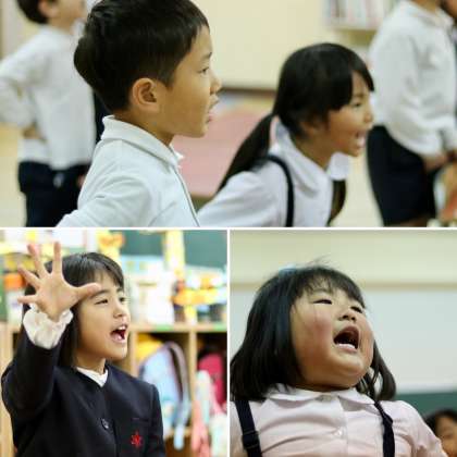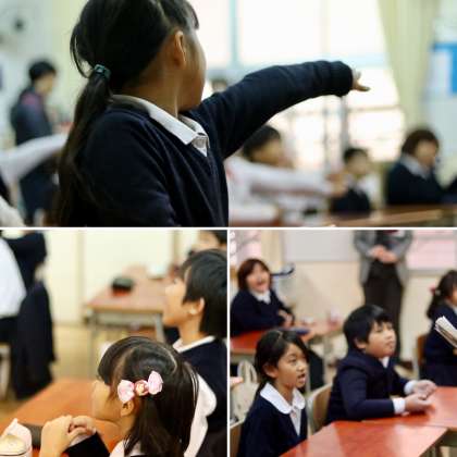 「見る」「聴く」「まねる」が音読の基本形です。目線を集中させて、石橋先生の範読を聴き、それをまねて声に出し、自分たちの音読を聴きます。学ぶとは「まねる」こと、教育の出発点です。