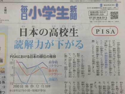OECD加盟37か国の学力到達度調査(PISA)の15歳の調査結果が発表されました。結果は、著しい「読解力の低下」です。内容をみると、「情報を捜す」「情報を読み取る」「情報から考察する」というものです。日頃から、新聞などの読み取りといった力が低下しているのではないかと考えられます。学校としては、その対応について検討していきたいと思います。