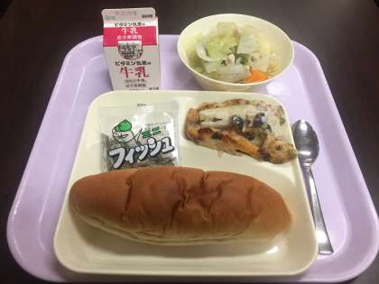 今日の給食は、鶏肉とじゃがいものスープ煮、きのこのドリア、ミニフィッシュでした。ドリアはたっぷりと量があり、食べごたえがありました。