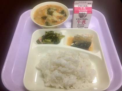 今日の給食は、さばのみぞれがけ、みそ汁、小松菜の煮びたしでした。和風の献立で、心がほっこりとしました。